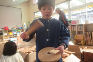 「わたしゃおんが~くか、山のおさる~」 朝の会で歌を歌いながら出した珍しい楽器! その変わった音色に「なにそれ~⁉」と興味津々の子ども達。 これはスウェーデンの木製打楽器(楽器おもちゃ)『トロムメール』 見たり触れたりし