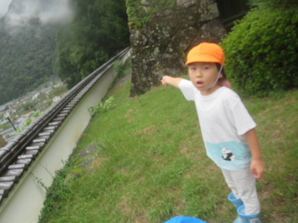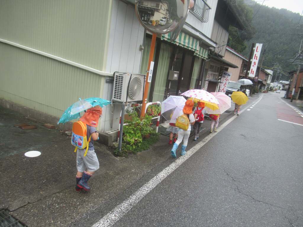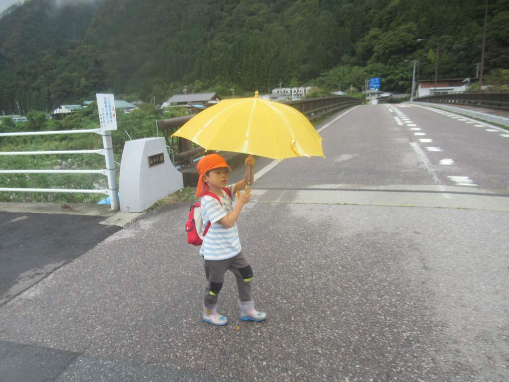 これは雨の日にしか体験できないことだ!小雨になったし、よし!出かけよう!ということで以上児さんは傘をさして出発!